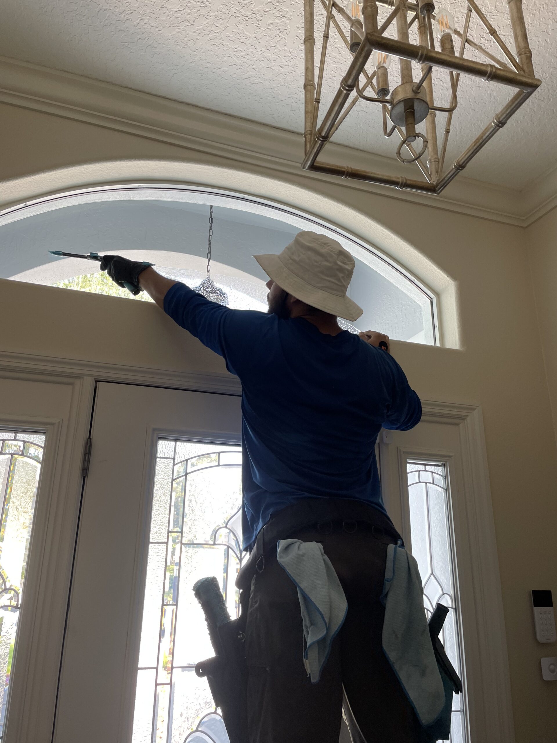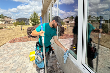 Technician cleaning exterior residential windows for a streak-free finish in The Villages, Florida